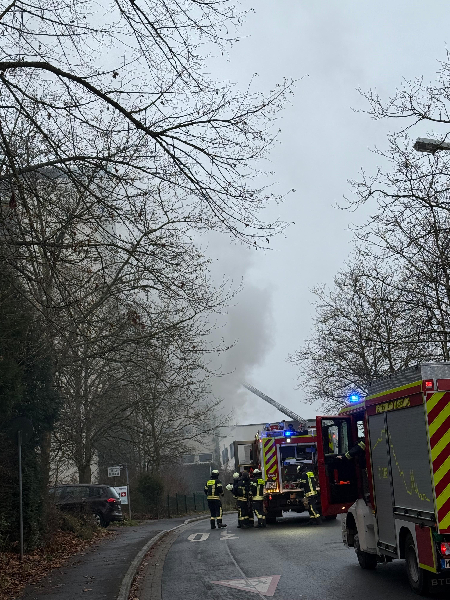 Löschangriff vorbereitet wurde. Parallel dazu rüsteten sich weitere Trupps mit Atemschutz aus, um das weitläufige Gebäude nach Personen zu durchsuchen und diese gegebenenfalls zu evakuieren.Die massive Rauchausbreitung erschwerte den Atemschutztrupps die Arbeit erheblich. Zur Unterstützung stellten sowohl die Freiwillige Feuerwehr Cappel als auch Kräfte des 1. Zuges zusätzliche Atemschutzgeräteträger bereit.